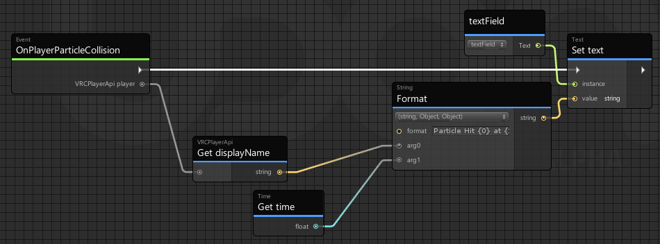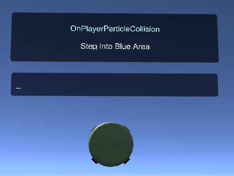 This demo has a setup similar to PlayerCollision above, where it uses a Trigger Area to start other events. In this case, when a player enters the Trigger Area, the SetActiveFromPlayerTrigger program will turn on the CollisionParticles object. This object has a ParticleSystem which fires at the player with World Collision and Send Collision Messages turned on. The Udon Program PlayerCollisionParticles attached to this object will fire the *OnPlayerParticleCollision events in the graph, which write the displayName of the affected player into the target text field.