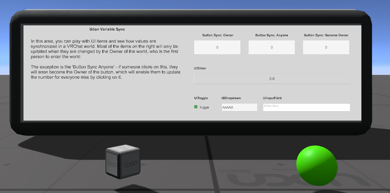These objects demonstrate different ways to sync variable values from the owner of an object to everyone else in the instance.