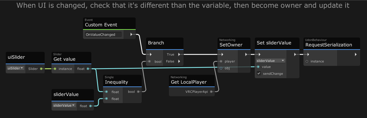This object has a program called SliderSync that works similar to ButtonSyncBecomeOwner. When someone moves the slider, they become the owner, and send the new value to everyone else. One difference is that when the "OnValueChanged" event is triggered from the UI, it will check whether this new value is different from the current value of the slider. This is because updating the value of the slider from Udon will also trigger this event, which would cause an infinite loop. So instead, we have some logic that makes sure the 'sliderValue' variable is different than the Slider's value before we run the rest of our logic.