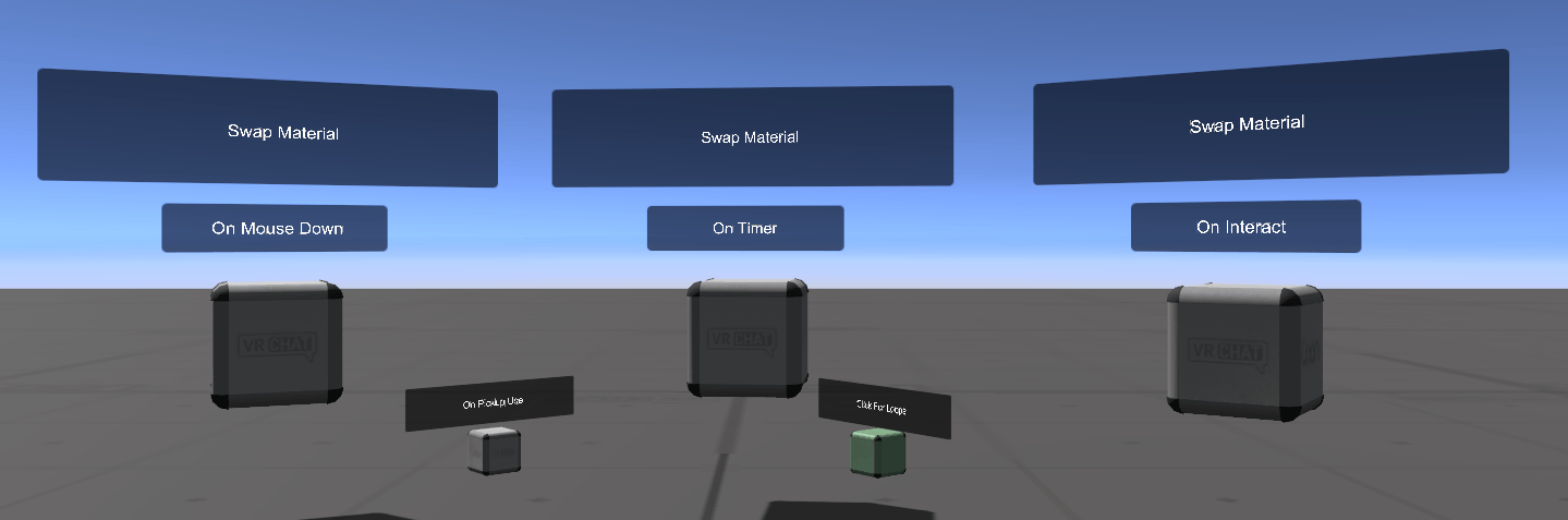 These objects demonstrate some simple things you can do with Cubes, mostly reusing a ChangeMaterialOnEvent program to show how you can trigger custom events from other objects.