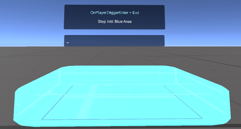 This is the most commonly used way to detect a player entering or leaving an area. The "TriggerArea" object has a see-through blue material on it, a Box Collider with IsTrigger checked, and an UdonBehaviour with a PlayerTrigger program source.