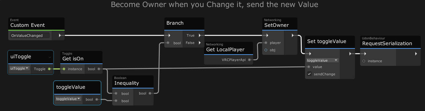 This object has a program called ToggleSync which works the same as the Slider above. When someone changes the value to something Inequal to the current value, they become the owner, and send the new value to everyone else,