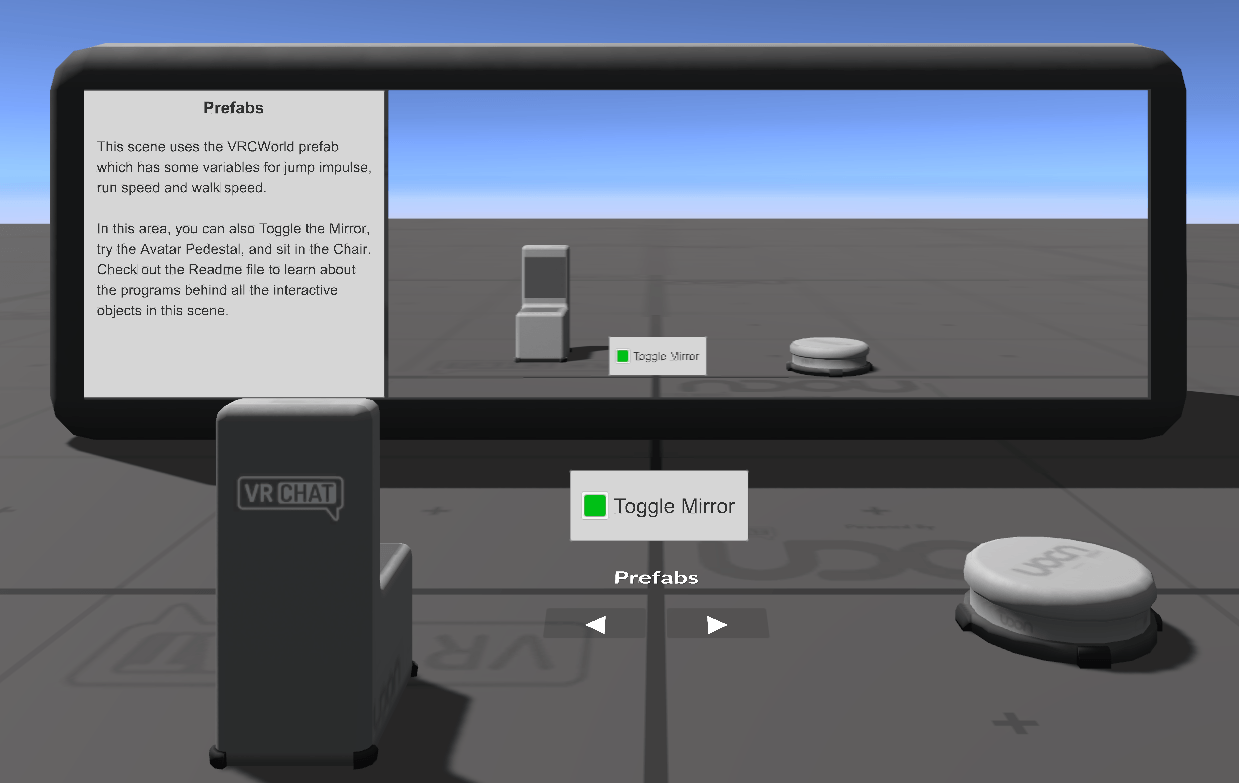 These objects show off some of the Prefabs included with the SDK which demonstrate default interactions with the VRChat components for Avatar Pedestals, Stations and Mirrors.