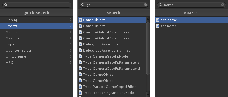 This mode is turned off by default, so first you need to go to your Welcome Screen by clicking on 'Welcome' in the upper-left corner of a graph. Then check the box next to 'Focus Search On Selected Node'. This gives you a shortcut to skip to Quick Search part two - if you have a GameObject.GetName node, you can select it and press Spacebar to open up a search for more GameObject methods.