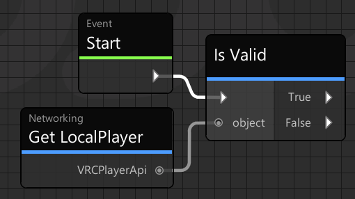 在您尝试玩家的获取或者修改任何东西,请确保 IsValid 返回 true。如果一个玩家已经离开了事件但是您依然在引用这个玩家对应的 VRCPlayerApi 对象,则会返回 false。为了更方便地在节点图中使用,请搜索通用的 “IsValid” 方法,该方法适用于任何对象,因为它为 “true” 和 “false” 提供了单独的流程。