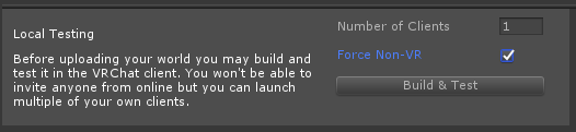 When testing many clients, it can be a hassle to arrange your windows and wait for VRChat to login every time you make a change to your world. You can change the 'Number of Clients' to launch to 0 to change "Build & Test" into "Build & Reload" This will build a new version of your world and move all open clients into that new local instance, skipping the VRChat startup sequence altogether.